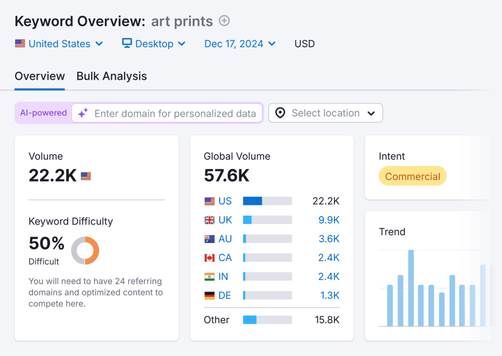 For example, let’s say you sell art prints online. When we enter “art prints” in Semrush’s Keyword Overview tool, you quickly see that it has a high search volume. But it’s also a difficult keyword to target.