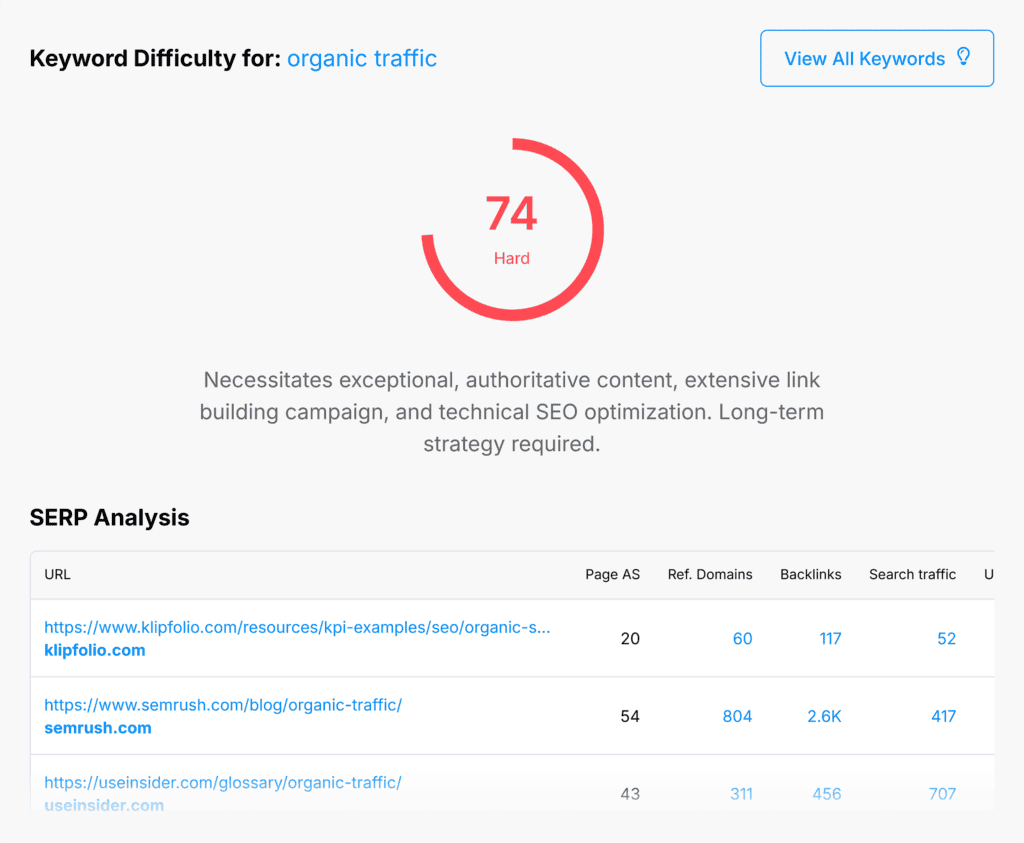 This information can help you understand far more about how tough a keyword will be to rank for than a score on its own.