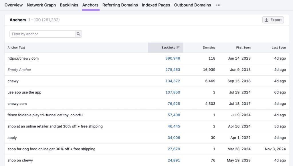 And if you navigate to the “Anchors” tab, you’ll be able to learn more about the anchor text distribution for the domain.