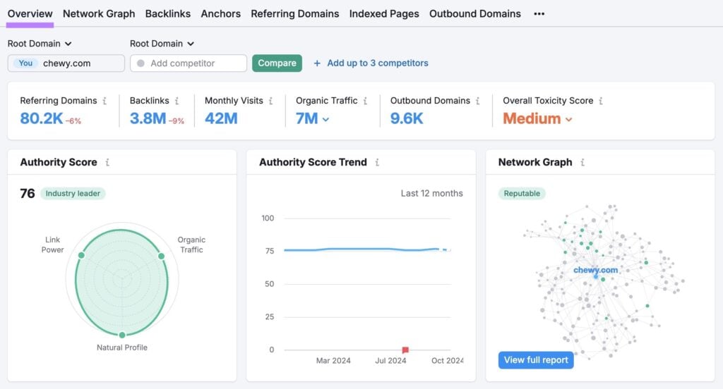 Tools like Semrush’s Backlink Analytics and Backlink Audit can help you protect your domain’s backlink profile. And they let you analyze your competitors’ link profiles to uncover quality link building opportunities.