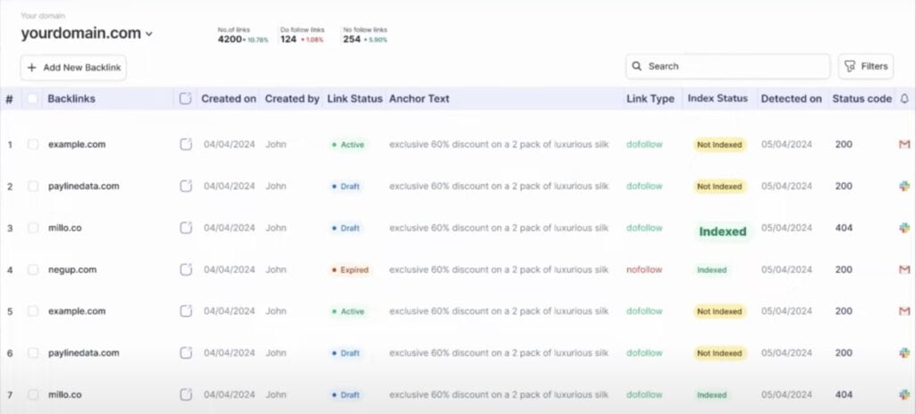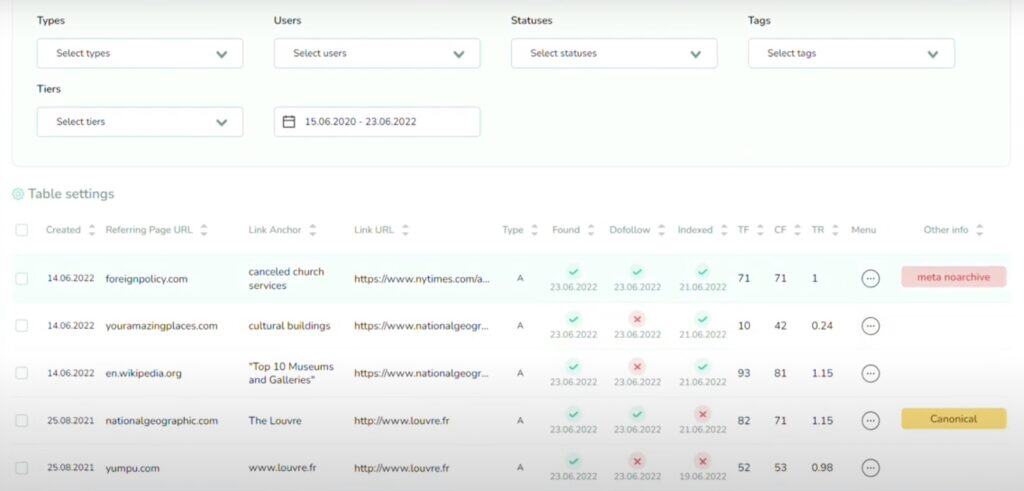 It lets you set up a dashboard to track link status, anchor text distribution, link building performance, expenses, and more. This helps you understand the effectiveness of your link building campaigns and the health of your overall link profile at a glance.