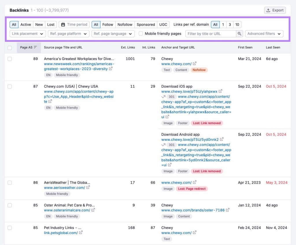 Navigate to the “Backlinks” tab to see more information about the link types and attributes.