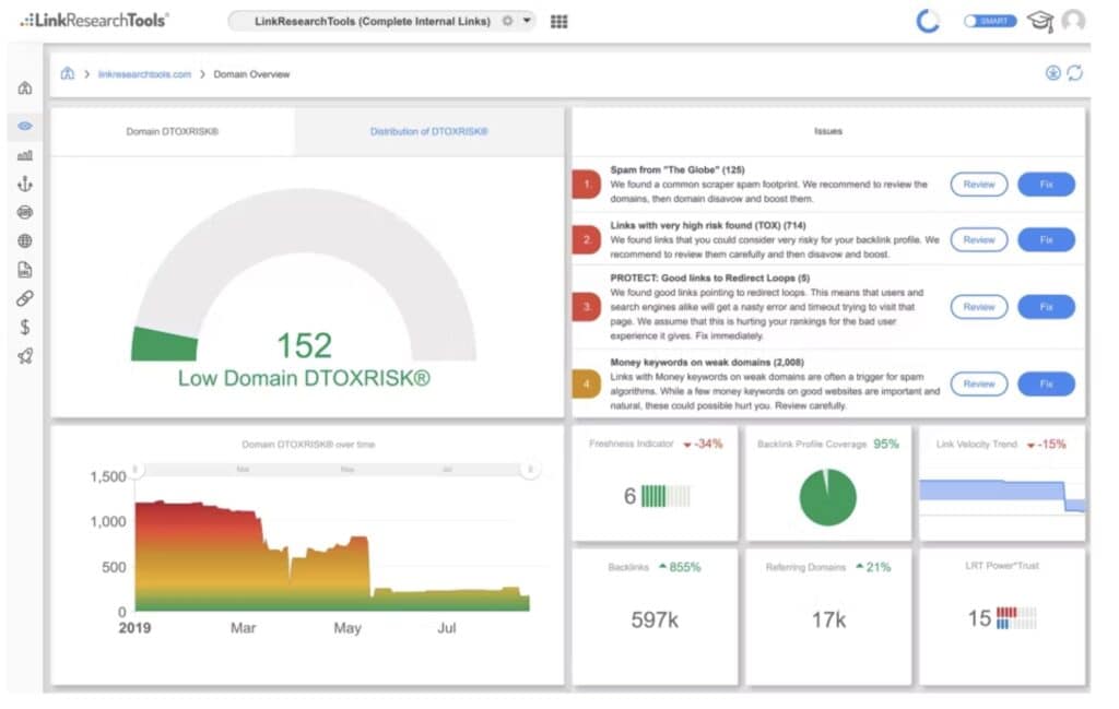 Link Research Tools offers a suite of tools for analyzing, monitoring, and improving your domain’s link profile.