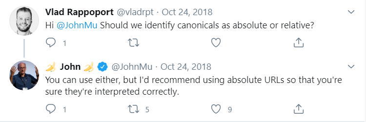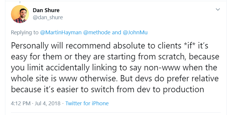 10 years ago, Google expert John Mueller argued that in his personal practice, he prefers relative URLs. They are easier to work with when testing links and moving content. The SEO specialist applied absolute paths to shares without specifying a domain name.