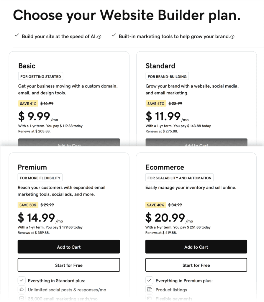 GoDaddy’s Website Builder has three pricing plans: