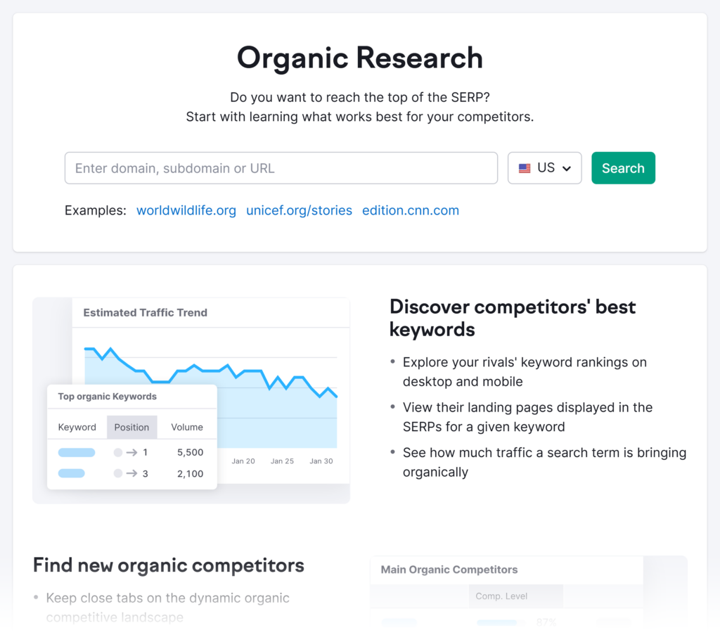 Use Semrush’s Organic Research tool to understand what your competitors are doing to reach their audiences. Because their target audience is likely similar to or the same as yours.