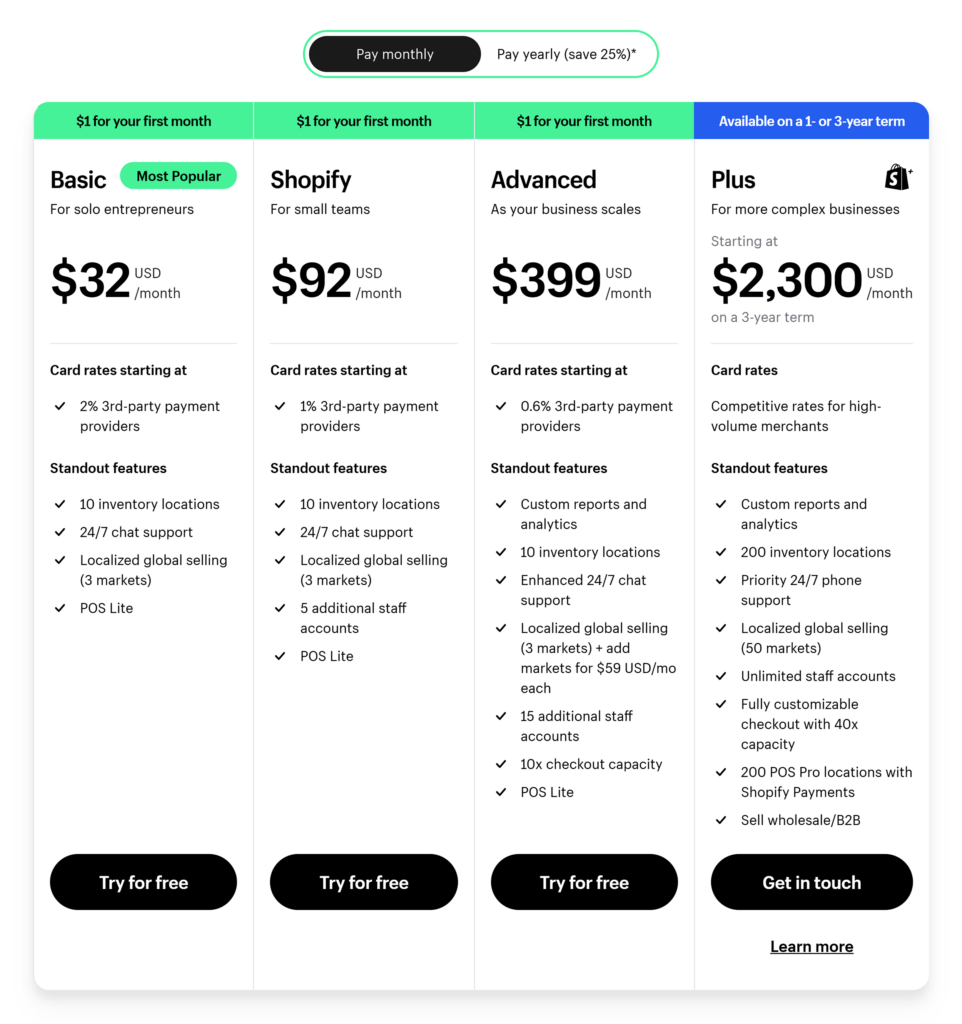 When you sign up to Shopify, you’ll get a 3-day free trial, then one month for $1. Once your first month is over, you can choose from any of the four plans: