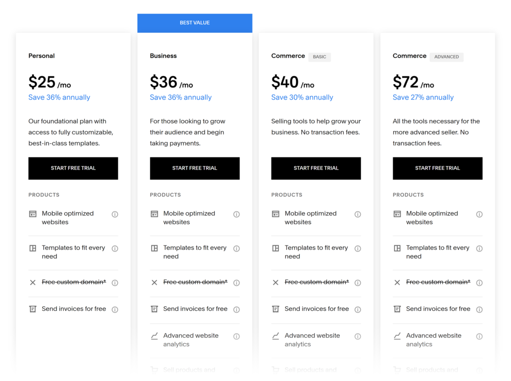 Squarespace offers a 14-day free trial with four paid plans: