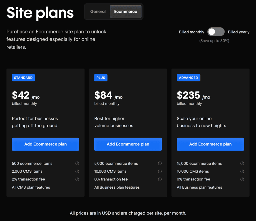 Webflow also offers separate pricing for ecommerce businesses: