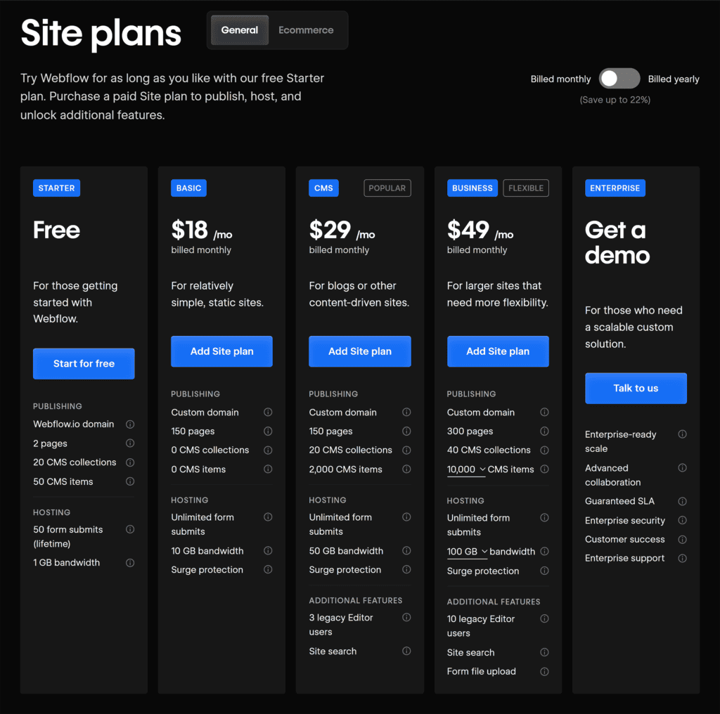 Webflow offers four pricing plans: