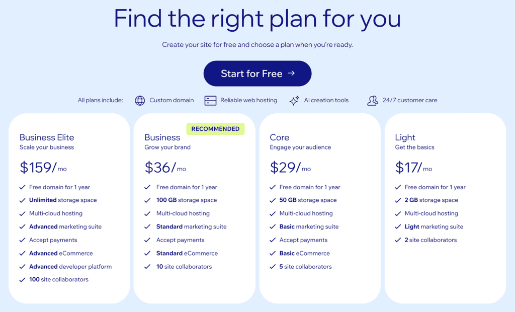 Wix offers four plans to build a website: