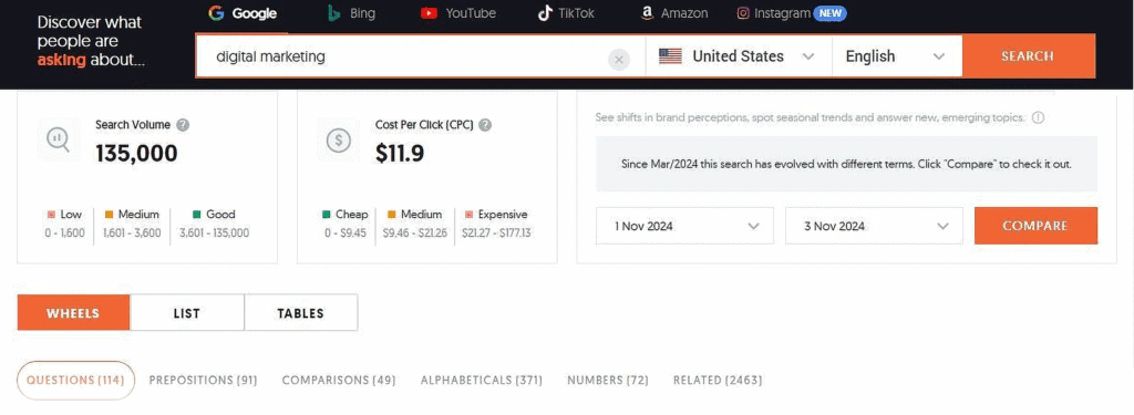 You’ll see common questions, comparisons, prepositions, and related terms. It’s an easy way to understand what your audience cares about.
