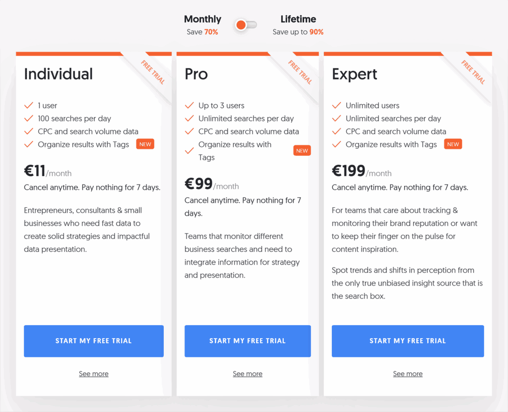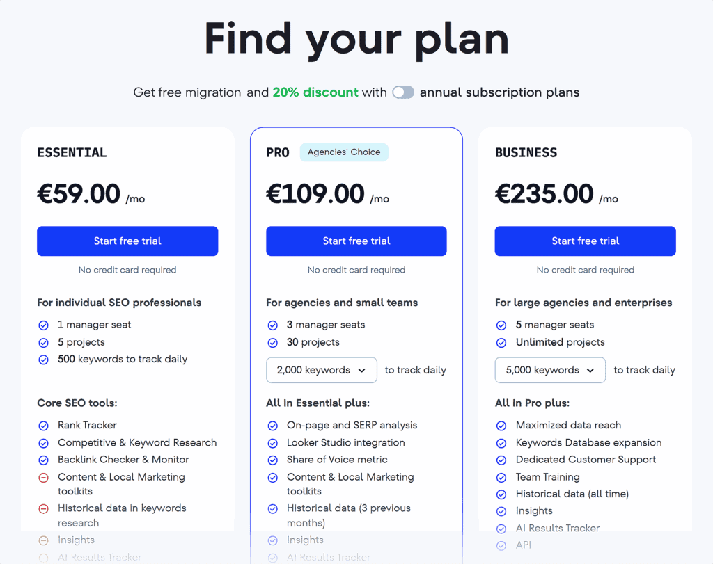 SE Ranking is a paid tool, but it offers a 14-day free trial. It’s also one of the cheapest keyword research tools available.