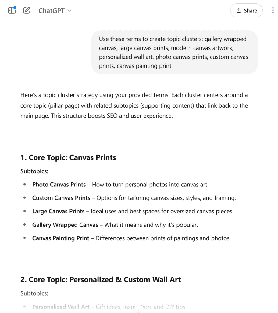 You can also ask it to group keywords into topic clusters or highlight gaps in your current content coverage.