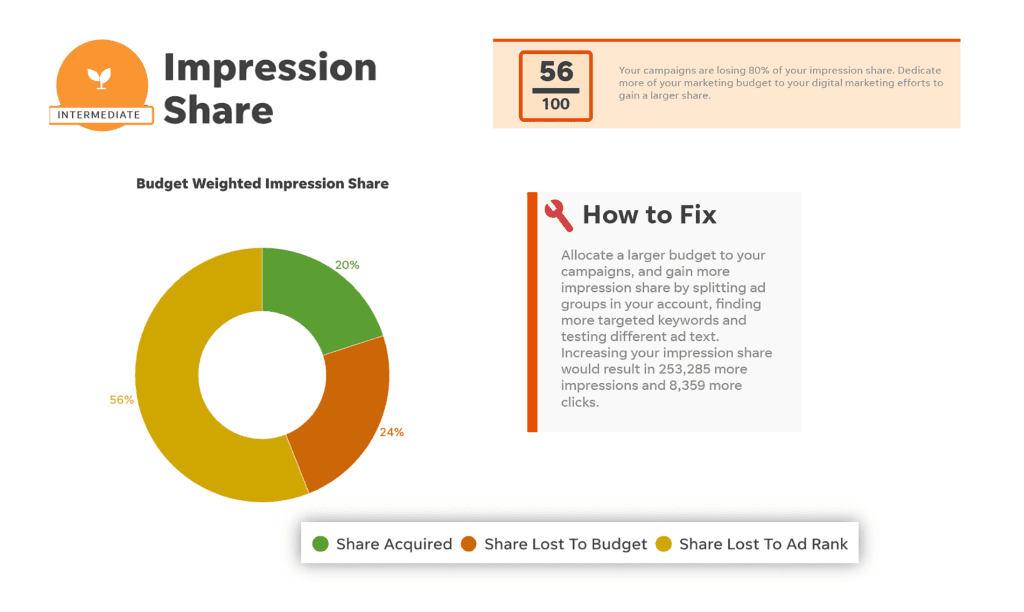 It evaluates keyword selection, impression share, and budget efficiency. Then, the tool highlights areas for improvement so you can boost performance fast.