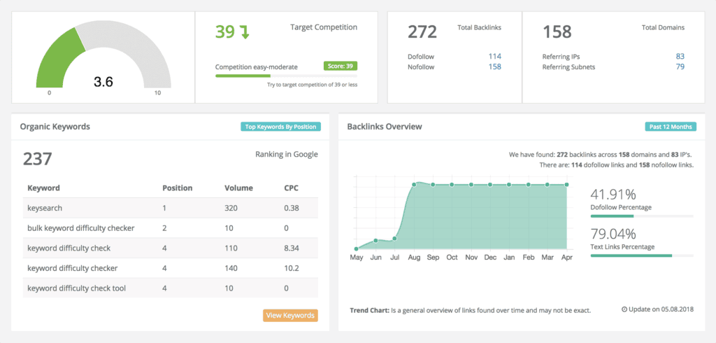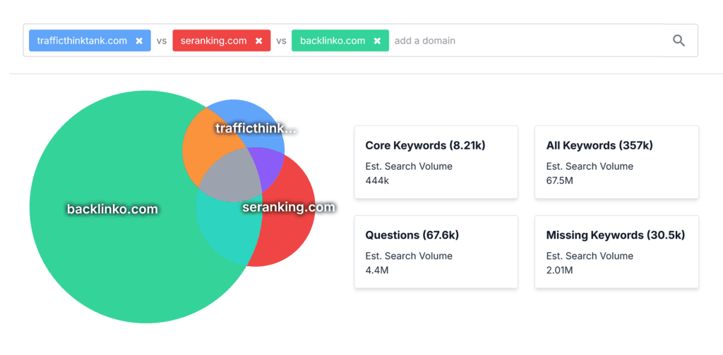 You’ll also get insights into keyword competition, backlink data, and domain strength.