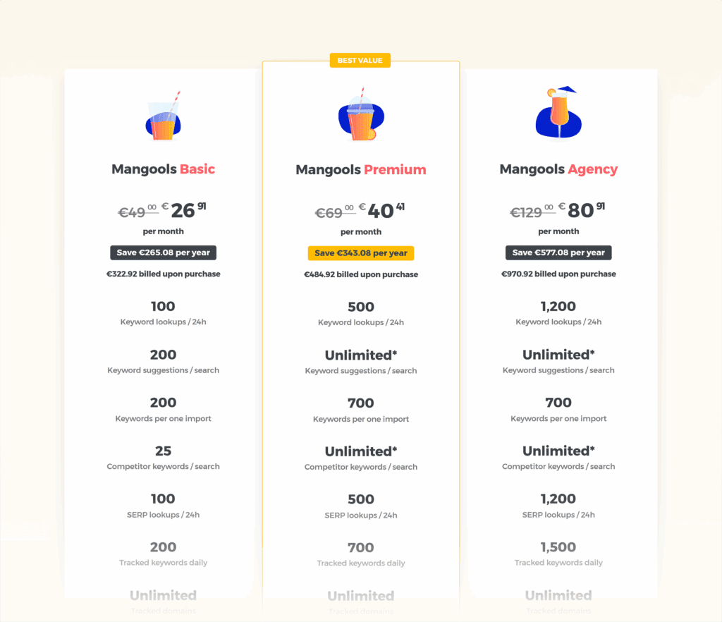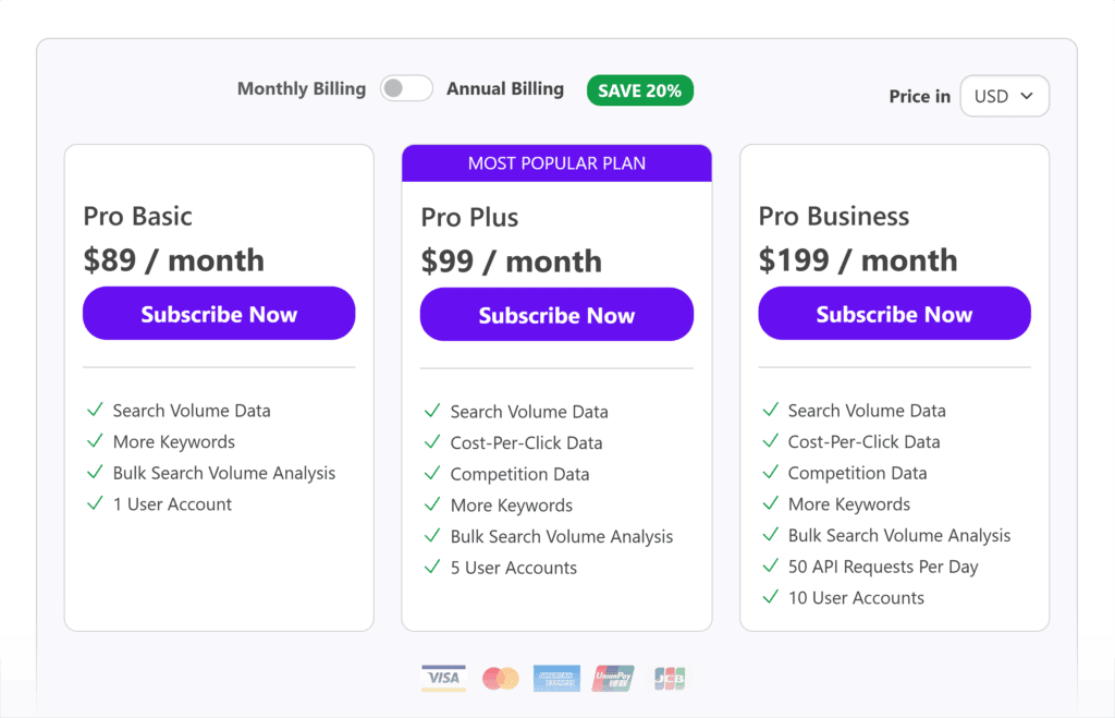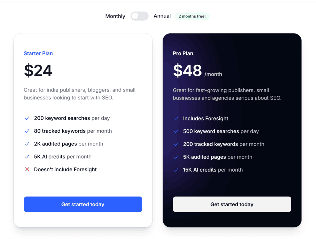 The Starter plan costs $24 per month. If you need more flexibility, the Pro plan is $48 per month and includes 500 daily keyword searches and 200 tracked keywords.