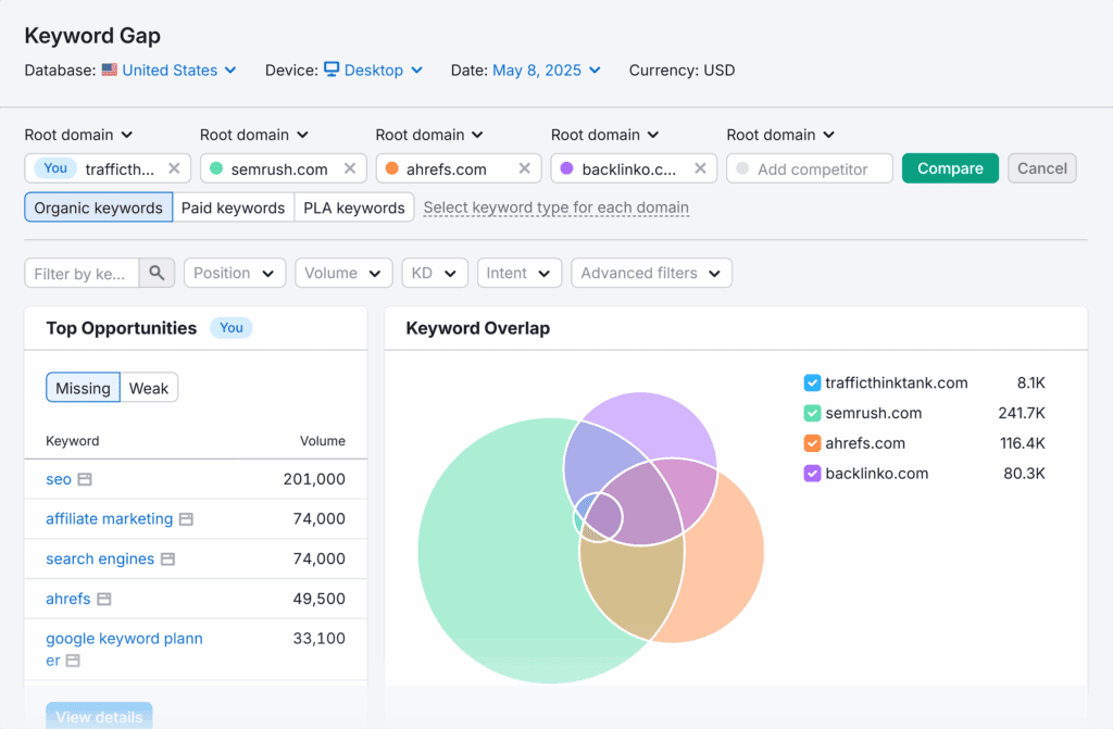 This makes it easy to spot gaps in your SEO strategy and prioritize new keyword opportunities.