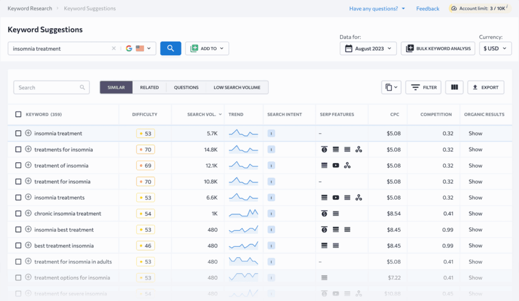 Just keep in mind that free tools usually offer limited data and may not include key metrics like keyword difficulty, search intent, and traffic potential.