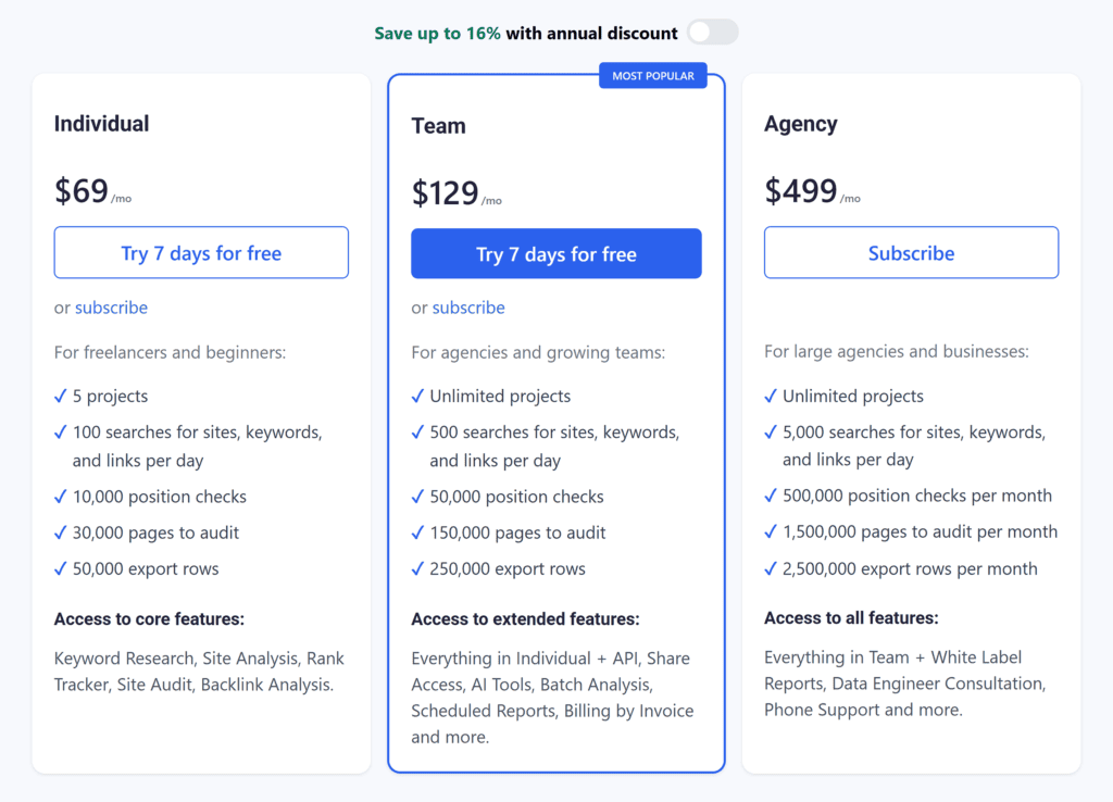 If you want to use all Serpstat keyword research tools, you’ll need a paid plan. The price starts at $69 per month for the Individual plan.