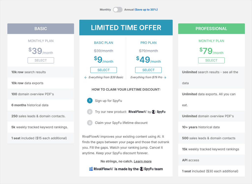 | SpyFu | $39/mo | Beginner: Easy to use out of the gate | Competitor keyword strategy insights |