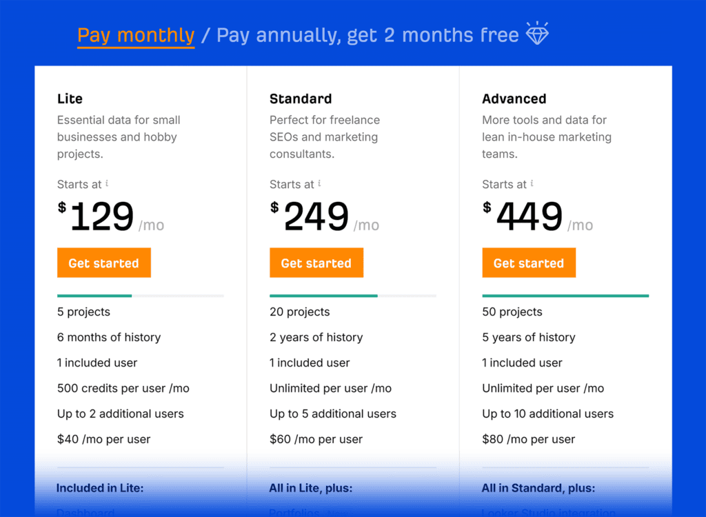 If you need competitive research tools or tracked keywords, you’ll need to go for at least the Lite plan, which is $129/month.