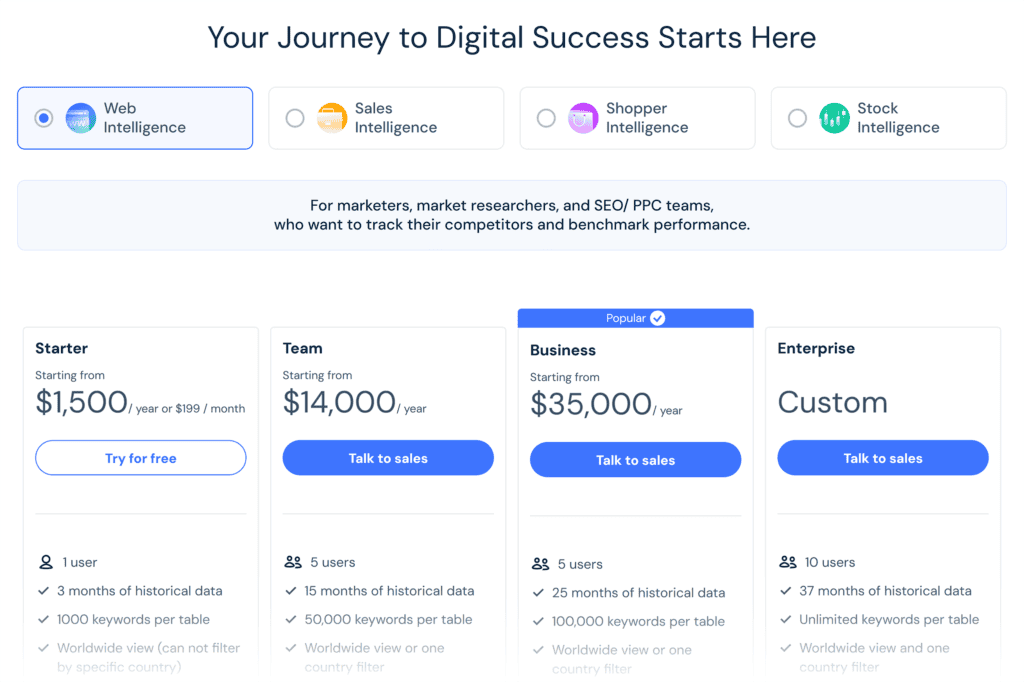 Similarweb’s pricing starts at $199/month for the Starter plan. It offers plenty of features for competitive intel and audience research, but it lacks any site audit or backlink features.